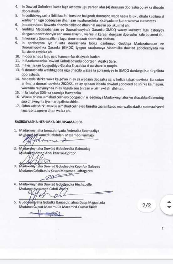 Madaxweynaha JF Soomaaliya, Mudane Maxamed Cabdullaahi Farmaajo, Madaxweyneyaasha maamullada Galmudug, Hirshabelle, Koonfur Galbeed iyo Guddoomiyaha Gobolka Banaadir ayaa waxay shirka ka soo saareen War-murtiyeed ka kooban ilaa iyo 15 qodob.