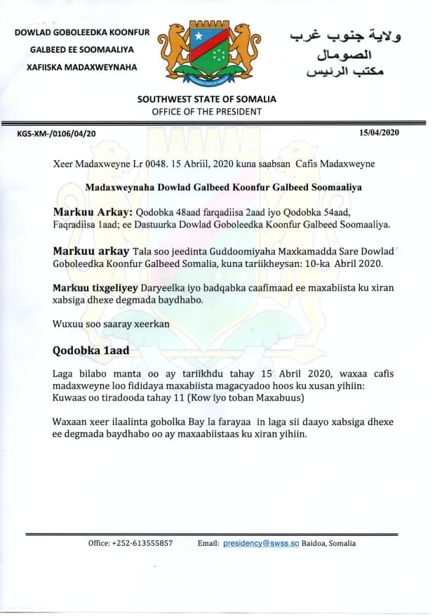 Warqadda ayaa lagu sheegay Madaxweynaha inuu dhageystay talo soo jeedinta guddoomiyaha Maxkamadda Sare ee Dowlad Goboledka Koonfur Galbeed, markii uu tixgeliyay badqabka maxaabiista inuu garowsaday cafiska maxaabiistaan.