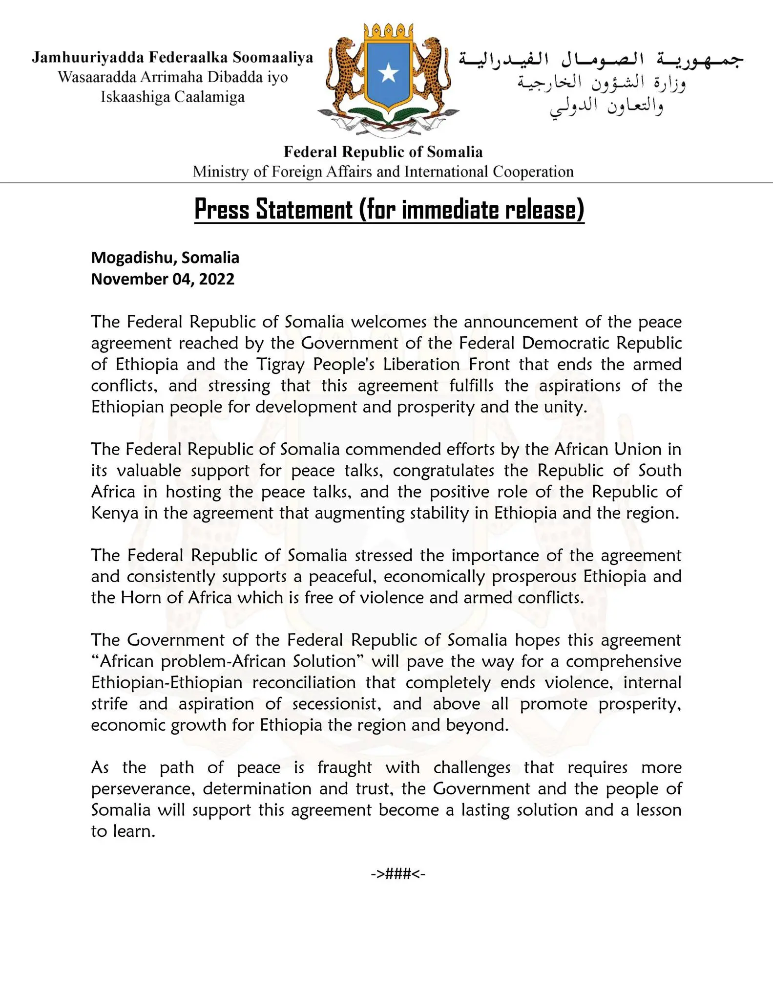 “Jamhuuriyadda Federaalka Soomaaliya waxay bogaadisay dadaallada Midowga Afrika ee taageerada qiimaha leh ee wada-hadallada nabadeed, waxay ugu hambalyeysay Jamhuuriyadda Koonfur Afrika martigelinta wada-hadallada nabadeed, iyo doorka wanaagsan ee Jamhuuriyadda Kenya ay ku leedahay heshiiska lagu kordhinayo xasilloonida Itoobiya iyo gobolka.”