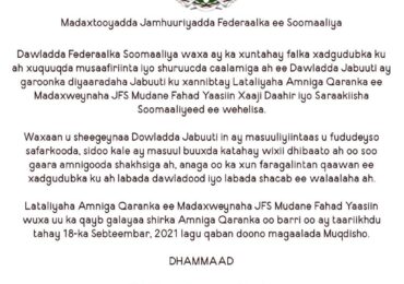 Muqdisho(Halqaran.com) Agaasimaha warfaafinta ee madaxtooyada Soomaaliya, Cabdirashiid Maxamed Xaashi ayaa xaqiijiyey in la-taliyaha amniga qaranka Fahad Yaasiin lagu celiyey garoonka diyaaradaha ee wadanka Jabuuti.