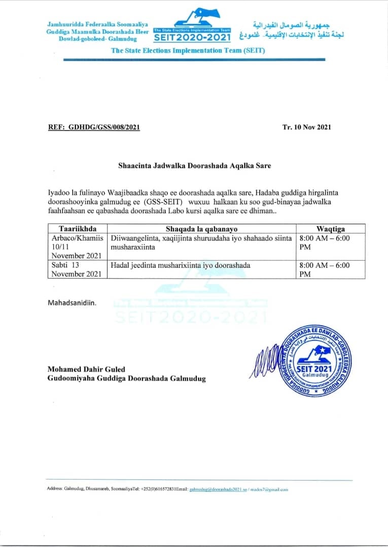 Muqdisho (Halqaran.com) –Guddiga doorashada ee maamulka Galmudug ayaa soo saaray jadwalka doorashada labada kursi ee Aqalka Sare, kuna harsan maamulkaasi.