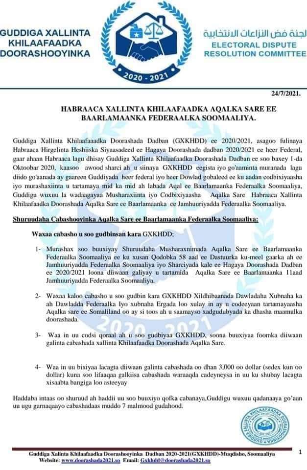 Muqdisho (Halqaran.com) – Guddiga xalinta khilafaadka Arrimaha doorashooyinka dalka ayaa soo saaray habraacyada lagu xalinaayo khilaafka ka dhasha doorashada Baarlamaanka Aqalka sare iyo shuruudaha loo baahanyahay in la soo buuxiyo.