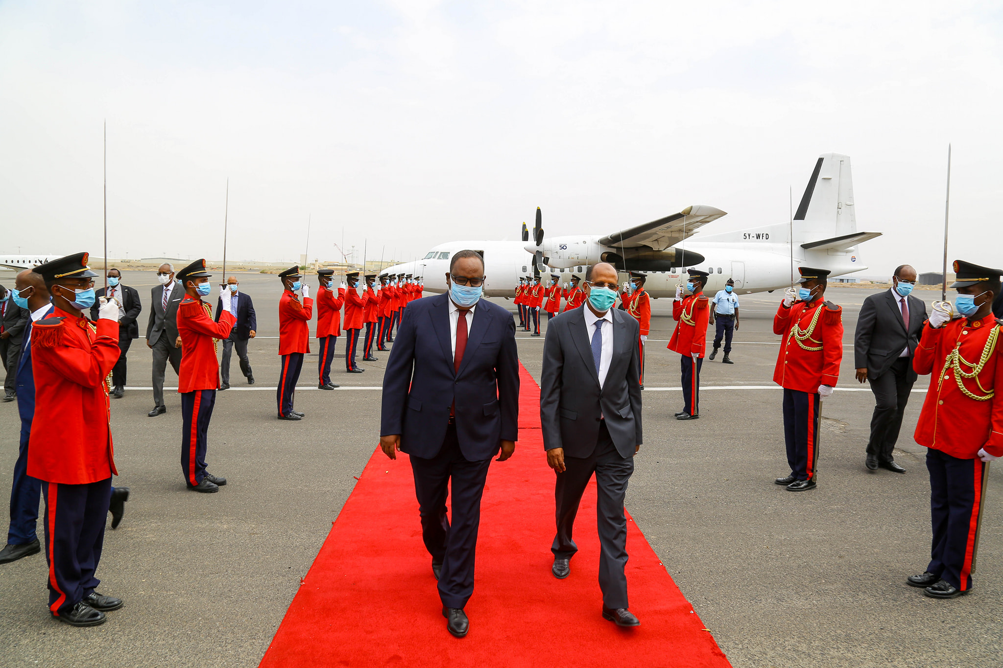 Madaxweynaha iyo wafdigiisa waxaa garoonka diyaaradaha ee caasimadda Jabuuti kusoo dhoweeyay, Wasiirka arrimaha dibadda ee Jabuuti Mudane Maxamuud Cali Yuusuf, Wasiirka gaadiidka Mudane Muuse Maxamed Axmed, Guddoomiyaha marsooyinka iyo aagga ganacsiga xorta ah Mudane Abuubakar Cumar Xadi iyo masuuliyiin kale.