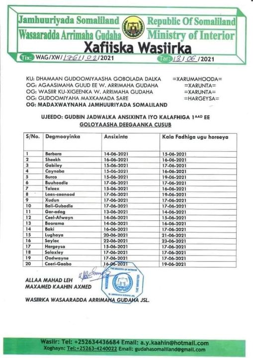 Waxay maxkamaddu warqad toos ugu socoto wasaaradda arrimaha gudaha Somaliland soo saartay ayaa sheegtay wasaaraddu inay soo sheegtay wakhti la ansixinayo xubnaha lagu soo doortay doorashadi ka dhacday Somaliland 31-kii bishii May.