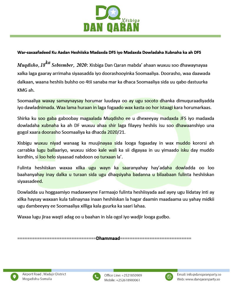 War-saxaafadeedka ka soo baxay Xisbiga Dan-Qaran ayaa sidoo kale lagu xusay, in Dowladda Madaxweyne Farmaajo ay aad uga liidato fulinta heshiisyada, iyada oo loogu baaqay in heshiiskan aan la hagar-daamin.