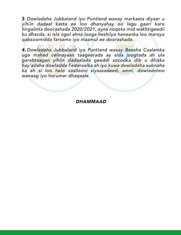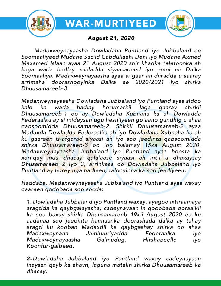 War-saxaafadeedka ayaa waxaa lagu sheegay in Madaxweyneyaasha maamullada Puntland iyo Jubbaland ay kuwada hadleen khadka teleefanka, isla markaana ay si dhow uga wadahadleen xaaladda dalka.