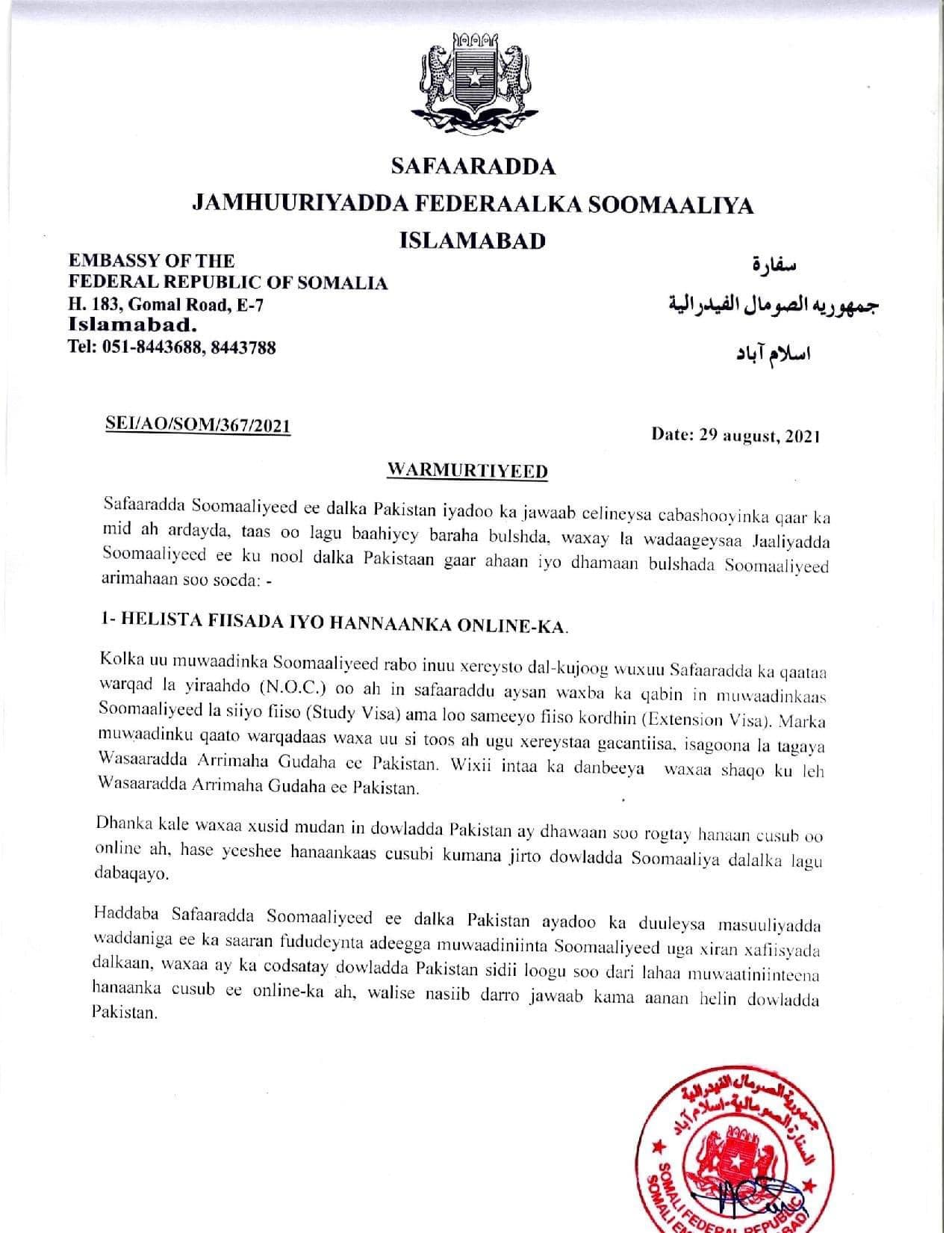 Islamabad(Halqaran.com) –Safaaradda Soomaaliya ee dalka Paakistaan ayaa ka jawaabtay cabashooyin iyo eedeymo culus oo kaga yimid Bulshada Soomaaliyeed ee ku nool dalkaasi, kuwaasi oo maal mihii ugu dambeeyay Baraaha Bulshada si weyn loogu faafiyay.