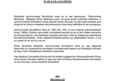 War Saxaafadeed ka soo baxay Somaliland ayaa waxaa Qarammada Midoobay, Midawga Africa, Midawga yurub, iyo guud ahaan bulshada caalamka lagu wargeliyay in Somaliland aysanb qeyb ka hayn doorashooyinka Soomaaliya.