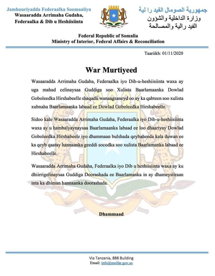 “Wasaaradda Arrimaha Gudaha, Federaalka iyo Dib-u-heshiisiinta waxa ay uga mahad celisay Guddiga soo Xulista Baarlamaanka Dowlad Goboleedka Hirshabeelle shaqadii wanaagsaneyd oo ay ka qabteen soo xulista xubnaha Baarlamaanka labaad ee Dowlad Goboleedka Hirshabeelle.