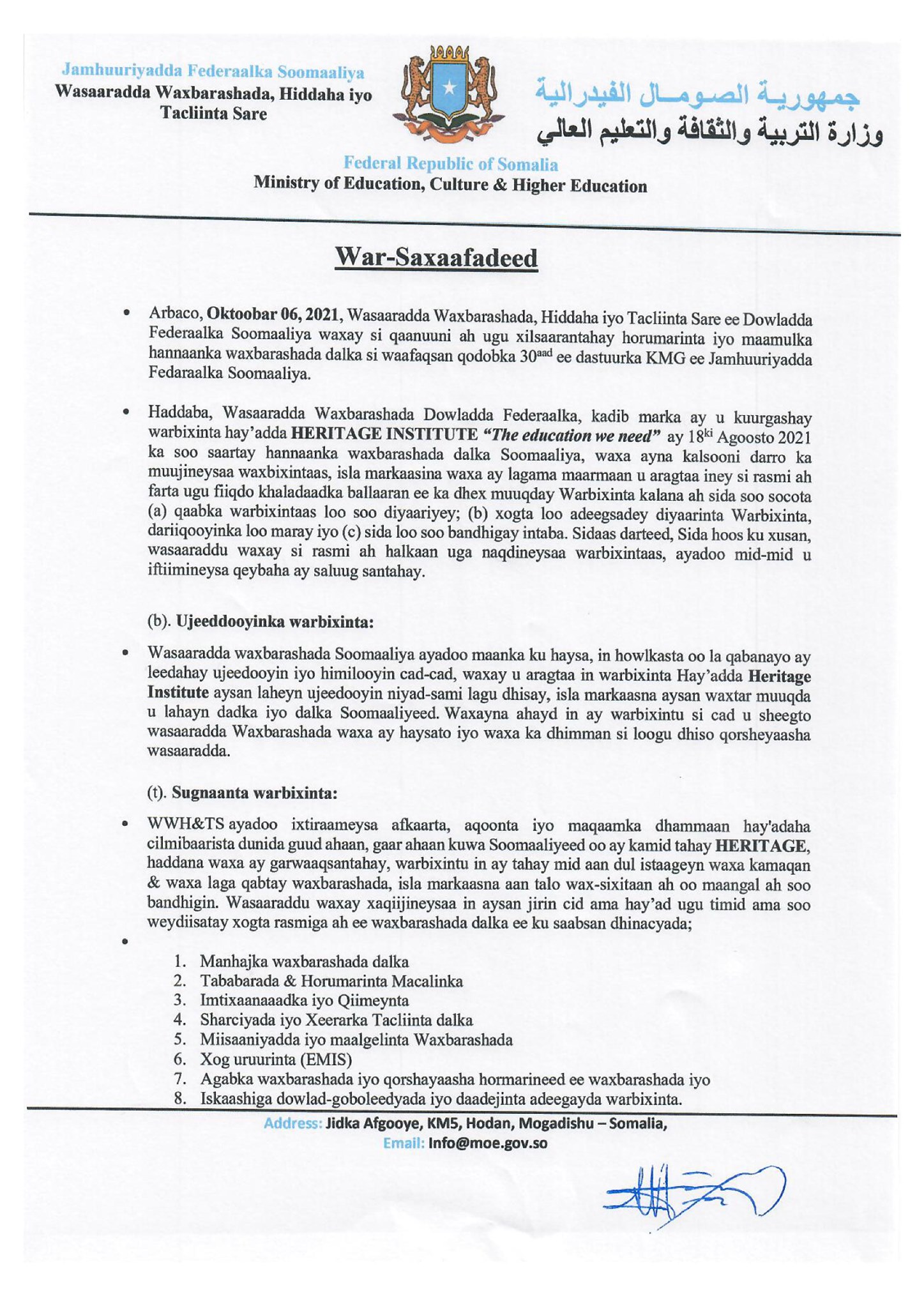 Warbixinta Heritage oo ciwaankeedu ahaa”WAX BARASHADA AAN UBAAHANNAHAY ”ayaa looga hadlay cabqadaha haysta waxbarashada si gaar ah dhinacyada manhajka, waxbarista, qiimaynta iyo maamulka iyada oo DFS iyo Dawladaha xubnaha ka ah Federaalka (FMS) kula talisay in ay xoogga saaraan nuxurka manhajka, kobcinta macallimiinta, qiimeynta iyo maamulka waxbarashada dalka.