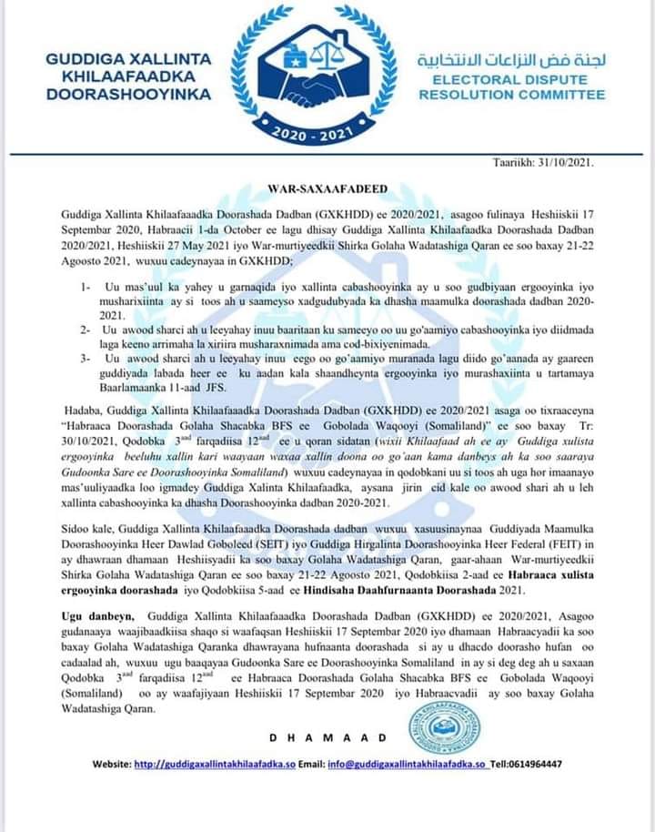 Muqdisho(Halqaran.com) –Guddiga Xallinta Khilaafaadka Doorashada 2020-2021, ayaa soo saaray warsaxaafadeed ku saabsan doorashadda golaha shacabka ee Kuraasta Goboladda Waqooyi.