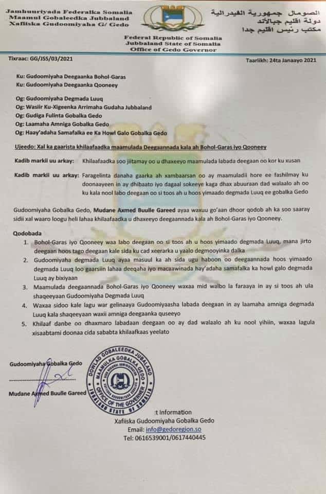 Guddoomiyaha maamulka Gobolka Gedo ee dowlada Soomaaliya Axmed Buulle Gareed ayaa qoraal kasoo baxay Xafiiskiisa waxaa lagu shaaciyay Shan qodob oo lagu xaliyay khilafka ka dhex-jiray mas’uuliyiinta labada Maamul, kuwaas oo kala ah.