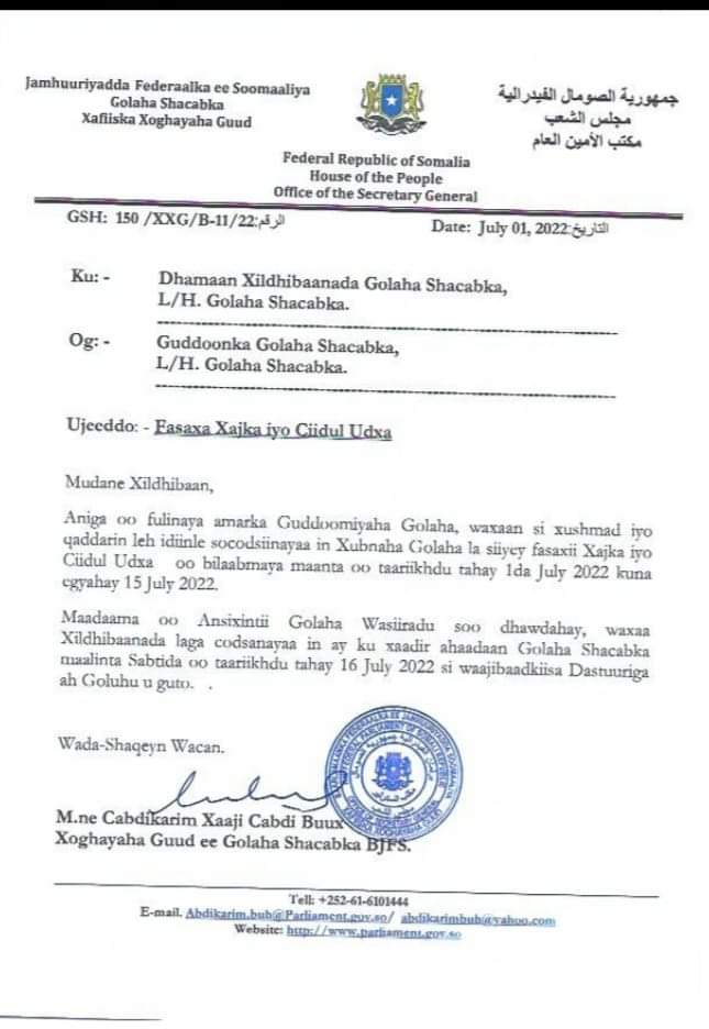 War qoraal ah oo ka soo baxay Xoghayaha Golaha Shacabka Cabdikariin Buux ayaa Xildhibaannadda looga codsaday in ay xaadir ku ahaadaan Golaha shacabka maalinta sabtida oo taariikhdu tahay 16 July 2022 si waajibaadkiisa dastuuriga ah Goluhu u guto.